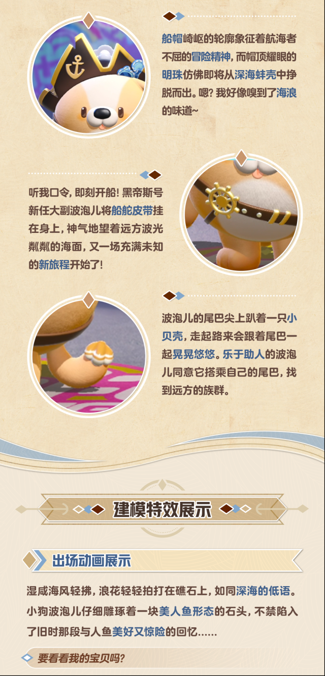 衣缀呆萌海星,身挂航海指针红色披肩代表踏上征途的勇气作为海上冒险家的闪宝有着绝佳的水下生存天赋头顶的星星灯照亮危险的深海为寻求宝藏的他指引一条明路
