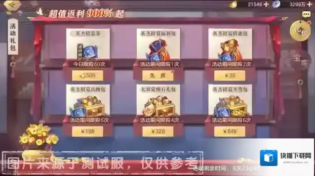 英杰招募至尊包:内含英杰招募券*60、元宝*6480,售价648元,活动期间限购6次。