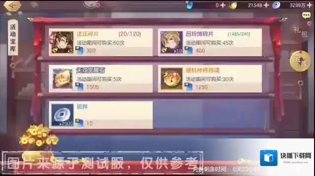 小将军们每次招募,必当额外获得「英杰宝珠」*60,在活动宝库中可兑换「吕玲绮碎片」、「法正碎片」、「无双觉醒石」、「随机神将将魂」等奖励。