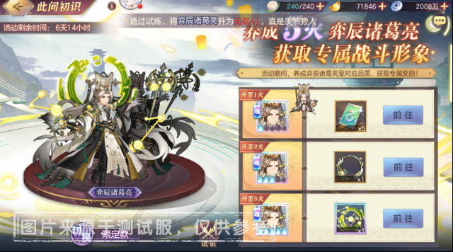 在此间初识模块中,本次活动将会开放「弈辰诸葛亮-限定款战斗形象」,并可在该模块中进行试玩,该活动奖励可在「弈辰诸葛亮」的觉醒等级培养至目标等级时获取!
