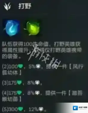 队伍获得100生命值,打野英雄获得属性提升:获得仅打野英雄携带的装备。