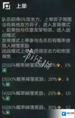 队伍获得5%攻击力,上单弈子周围没有其他友方弈子,进入发育模式,如果他与任意友军相邻,进入团战模式