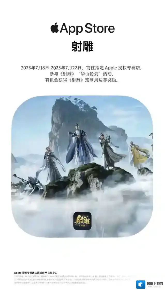 《射雕》Apple 授权专营店活动持续进行中!截止至7月22日,前往全国 Apple 授权专营店打卡体验射雕,就可以获得《射雕》定制五子棋,带话题#射雕华山论剑五绝体验送福# 分享门店活动体验照片 / 视频到抖音、小红书、微博,并前往公众号留言上传截图,即可获得 CDK 礼包码奖励!(内含寻武令*5),更有机会参与抽奖!官方将抽取 6 位幸运玩家,赠送《射雕》定制 “四季予你・靖蓉拼图” 盲盒!