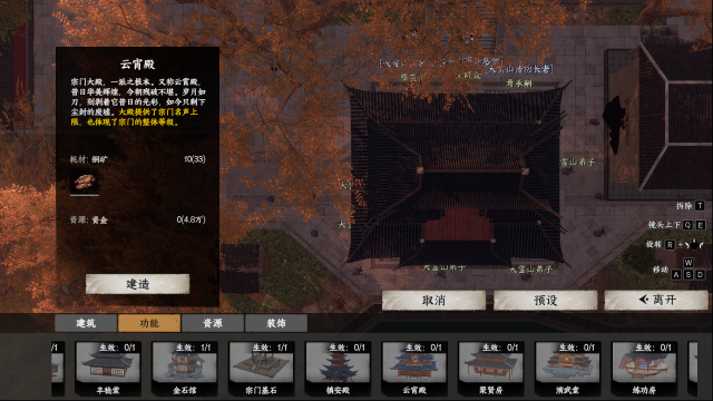 建造云霄殿可以消耗资源,提升大殿等级,提高声望上限,矿石,资金存储上限,门人上限