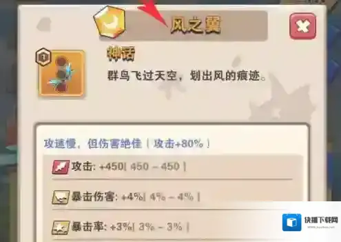 4、风之翼:神话品质的弓,攻击力高,但攻速慢,暴击伤害提升80%。
