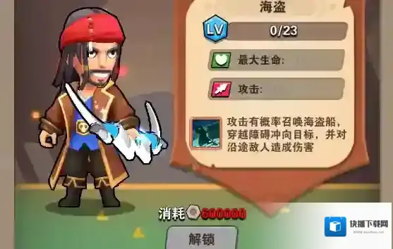 2、技能:攻击有概率召唤海盗船,穿越障碍并对沿途敌人造成伤害。