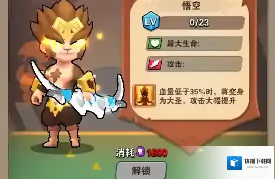 2、技能:血量低于35%时,变身为大圣,攻击大幅提升。