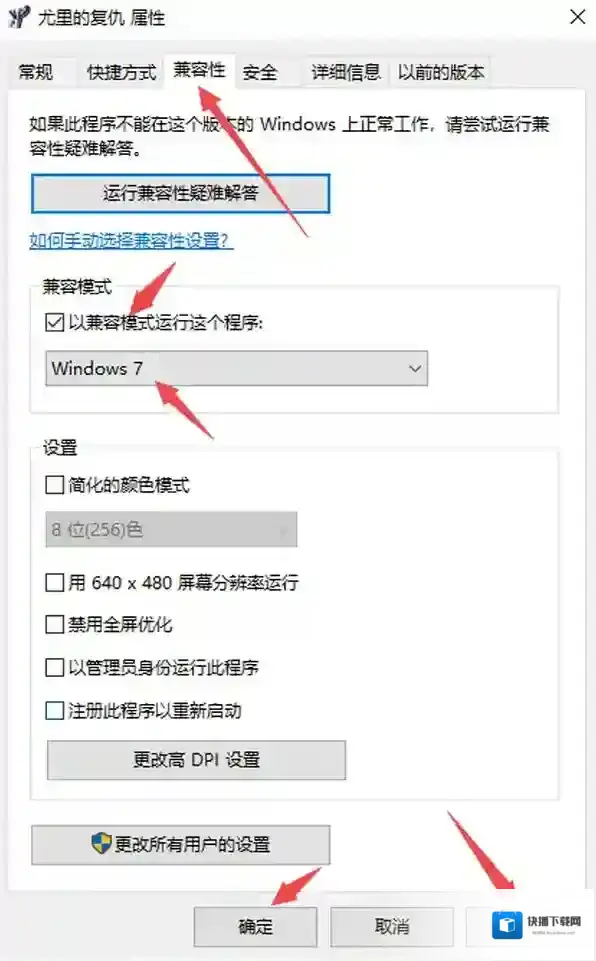 二、找到桌面上的游戏图标,按下鼠标右键,然后选择属性功能,接着在兼容性窗口中,勾选以兼容模式运行这个程序,并将其下方的选项选择为Windows7,最后点击应用再点击确定按钮即可。