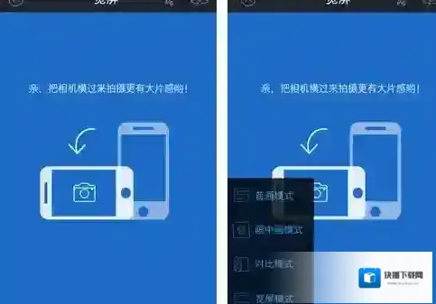 足记使用的方法也很简单。点中间的蓝圈会有文字、照相和爆料选项,选择照相会直接出现拍照功能,选左下角里面的横屏模式,可以直接拍,也可以到相册中选照片,很方便。