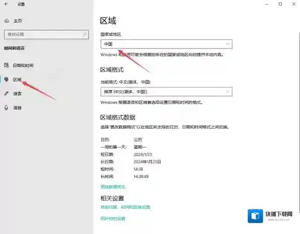 第六步,点击左侧的区域选项,最后将右侧区域下的国家或地区选择为中国。