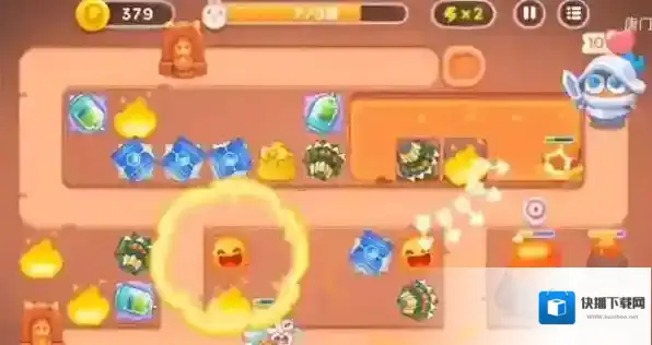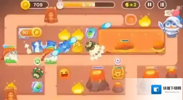 4、清掉下面的一个小火山,放置一个太阳,第四关会有速度很快的大兔子,一边清除这一波兔子一边升级炮台。