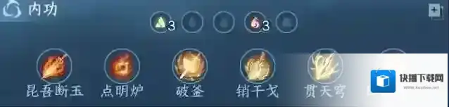 依旧是选择3金3火内功,昆吾+点名炉+日月两仪推荐必带,词条收益实在太低可以换一个擒丹火上去,其他可选有金/木凛风绝刃、揽狂风/破重云。