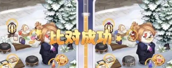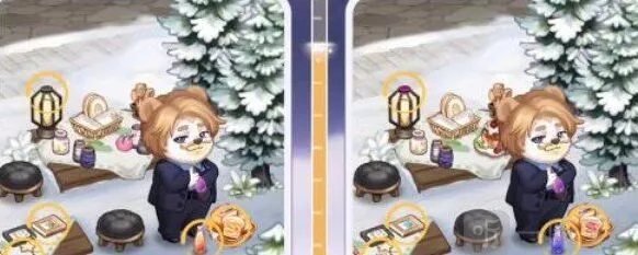 第六处:小奥比身后的甜品不一样,一个是桃子,一个是蛋糕;