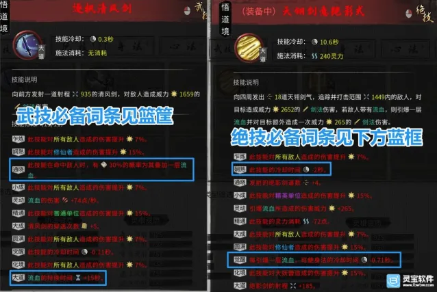 (2)图中标注的关键词条中,其中:引爆流血,减低身法CD时必须有的!