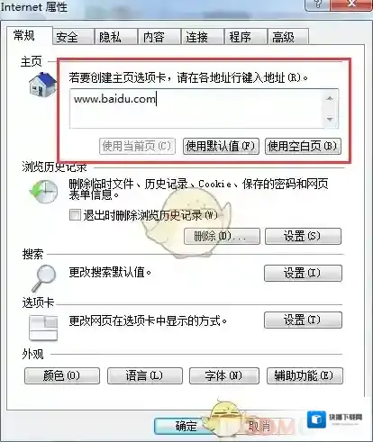 3、还是在“工具”里打开“选项”,然后在选项界面的右上方打开“Internet选项”,之后在“常规”界面的“主页”里填写我们想要的网址,最后点击确定就可以了。