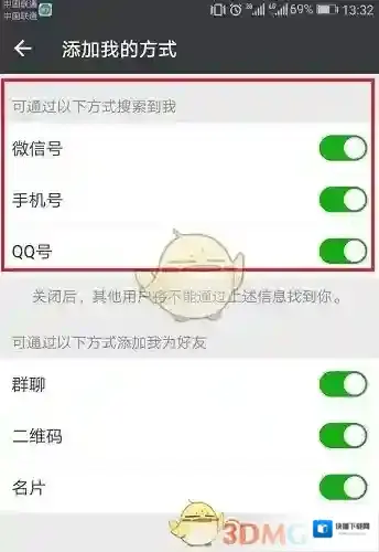 5、进去添加我的方式这一界面,可以看到三种方式全部关闭了,这就是搜不到账号的原因,如下图所示: