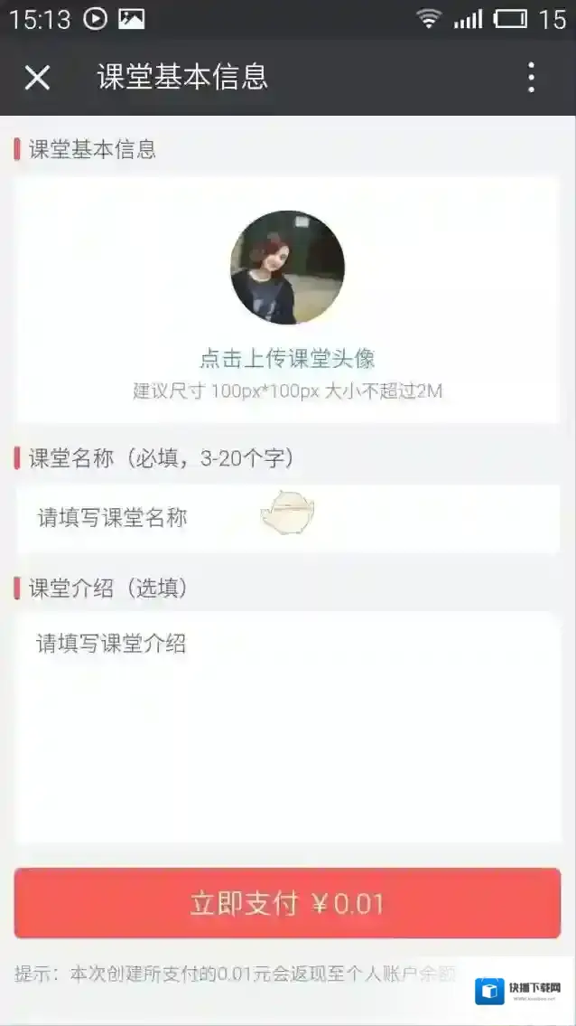 4、点击上传课堂头像(课堂头像默认为注册微信的微信头像)、填写课堂名称(课堂名称长度要求为3-20个字)、填写课堂简介。完成填写后点击“立即支付¥0.01”进行微信支付验证