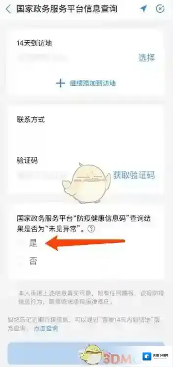 4、国家政务服务平台“防疫健康信息码”查询结果如果是“未见异常”,一定要选择“是”。(图3红色箭头处)