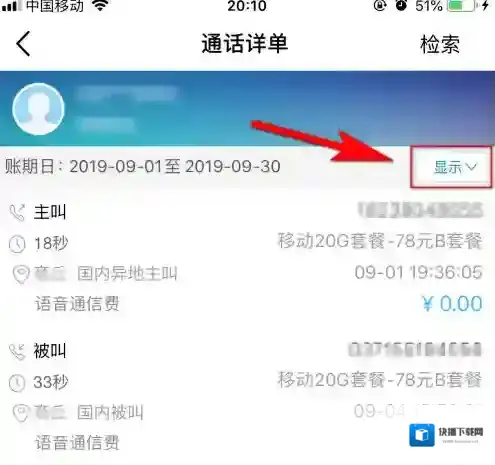 5、进入之后就可以查看通话详细记录,右上方还可以点击‘显示’可以选择不同时间去查看移动通话详细记录。