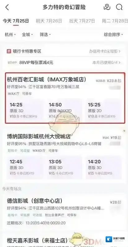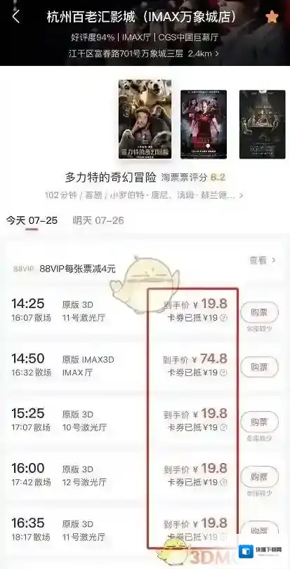 6、选好影城后,就选择一个你想观看的时间。如下图所示,APP已经自动显示使用消费券后的价格了,选好时间后点击“购票”。(因为小编是88VIP,所以还可以和消费券一起叠加使用优惠哦~)