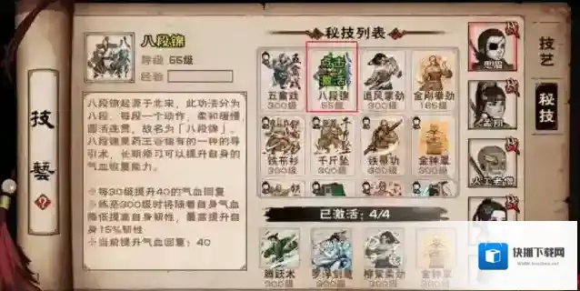 5、解锁李长青八段锦的修炼后,可以在秘技列表里激活八段锦,可以看到八段锦的效果。