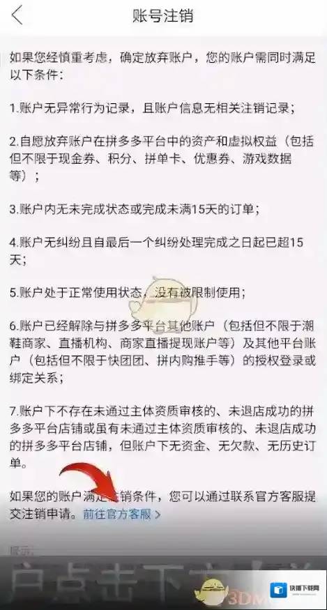 3、查看账号注销条件,满足条件的用户点击下方前往官方客服,