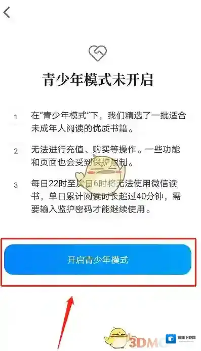 4、最后点击开启青少年模式即可。开启后平台会精选更适合青少年阅读书籍,并且阅读时长也会受到限制,还无法进行充值、购买等一系列操作。