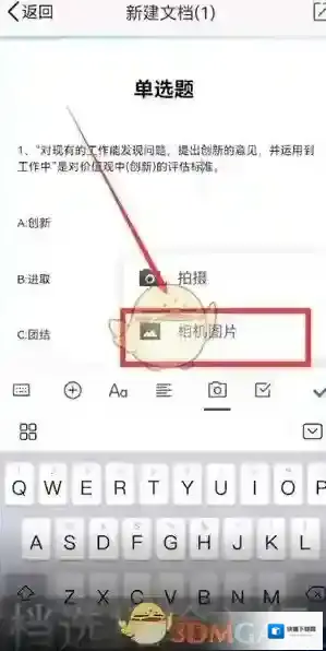 5、点击文档选择输入框上方的相机,选择相机图片,即可插入图片。