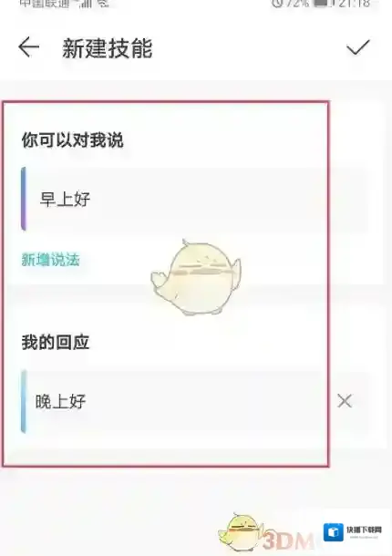 5、进去之后,先输入说法,然后自定义回复,点击对勾,华为手机语音助手就自定义回复了。