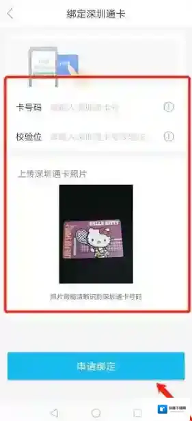 5、输入深圳通卡的卡号码和校验码,上传清晰的深圳通卡照片,点击申请绑定。(卡号码就是深圳通卡右下角的前面9个阿拉伯数字,校验码就是最后括号里面的1个阿拉伯数字)