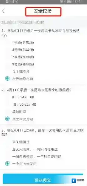 6、进入到安全校验页面,回答3个校验问题,确认提交。这个是为了证明卡是本人现持有的。