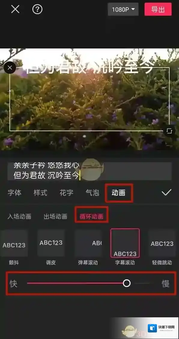 4、在动画的循环动画里,选择字幕滚动,然后拉动横条即可变慢滚动速度。