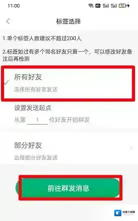 5、可以选择“所有好友”或“部分好友”,也可以“设置发送起点”。选好后点击“前往群发消息”。
