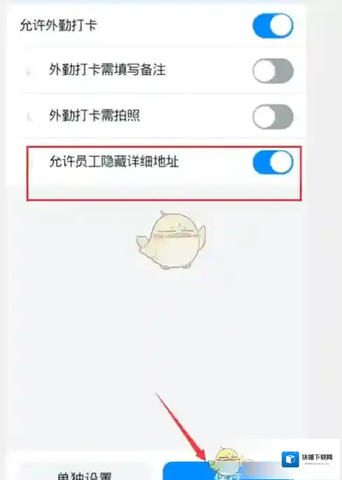 《钉钉》打卡隐藏详细地址设置方法 2025-07-20 08:25:44 编辑: 小朱朱 分类: 应用教程 • 阅读: 804 1、打开钉钉,点击主页下工作选项。 2、点击考勤打卡选项。 3、进入考勤打卡下边设置选项。 4、点击高级设置–外勤打卡设置。 5、开启允许员工隐藏详细地址–保存设置完成。 本文内容来源于互联网,如有侵权请联系删除。 钉钉应用相关内容 全部 钉钉考勤打卡 钉钉选项 钉钉点击 钉钉 钉钉详细地址 钉钉设置 钉钉转让群主方法 钉钉进入页面 1、打开钉钉群聊天页面,点击设置。 钉钉点击 2、进入页面后,点击群管理。 钉钉转让群主 3、进入页面后,点击转让群主。 钉钉群聊天 4、进入页面后,点击需要转让给的群成员。 5、进入页面后,点击确定即可。 2025-09-23 发表回复 请登录后评论... 登录后才能评论 评论列表 ( 0条)