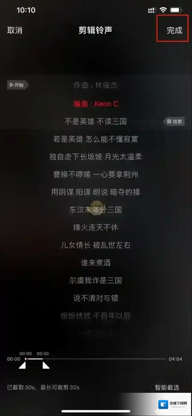 4、在剪辑铃声界面中,截取想要的铃声,点击右上角完成。