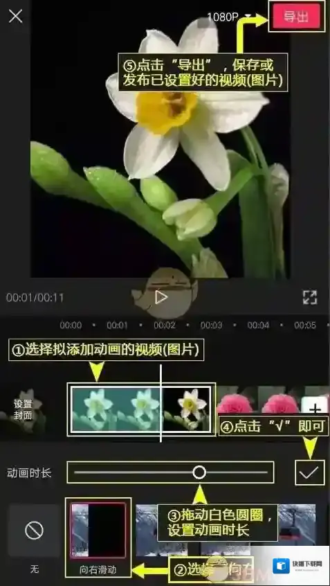 7、选择拟添加动画的视频(图片),点击“向右滑动”,设置动画时长,点击“√”,最后点击“导出”,保存或发布已设置好的视频(图片)。