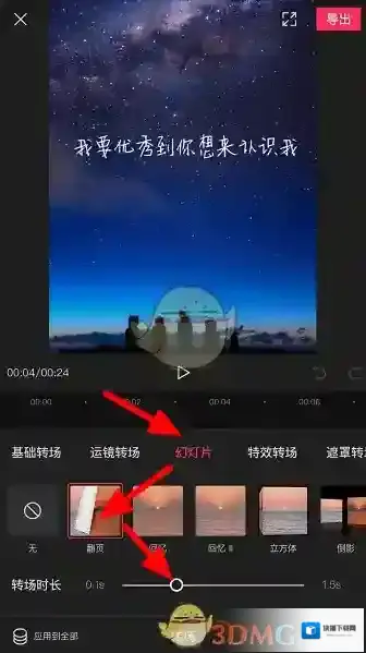 4、点击“幻灯片”分类,选择“翻页”,调整时长,点击“√”即可。