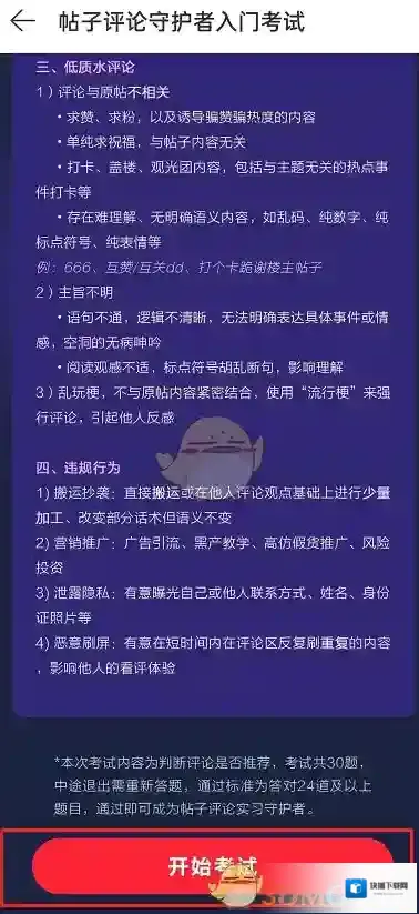 4、进入后,滑动到最后,点击开始考试。通过考试即可成为这个版块的守护者。