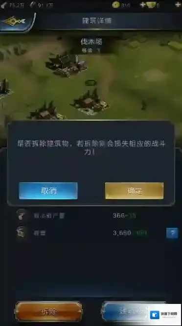 拆除:把当前伐木场变为空地,拆除后可以建造其他建筑,拆除伐木场没有消耗。