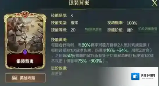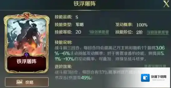 前三回合,每回合都会提高主将和随机副将主动技能发动概率,对准备技能有更高的效果,可叠加。这个技能几乎就是为准备队量身打造的,在准备技能比较多的环境中拥有着非常巨大的辅助效果。
