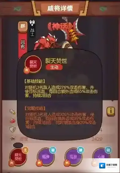 打法思路:吕布的主动技能裂天焚世的使用效果是对随机3名敌人造成276%攻击伤害,并使目标流血每回合额外造成65%攻击伤害,持续2回合。那么吕布的技能已经可以看出在整个战斗中吕布才是输出的核心,保护好吕布就是最好的打法!