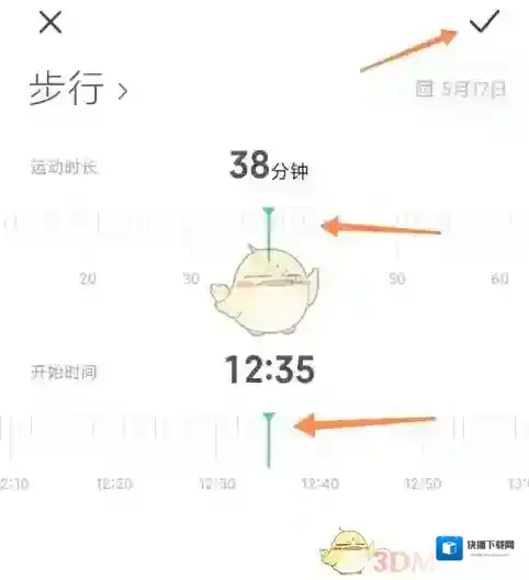 6、修改运动时长,步数会同时修改,点击对号,完成纠错操作。