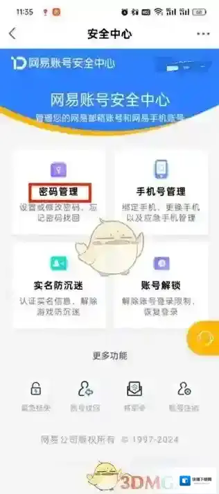 4、之后进入到安全中心的页面中可以看到有密码管理、手机号管理、实名防沉迷等功能,在这里点击密码管理;