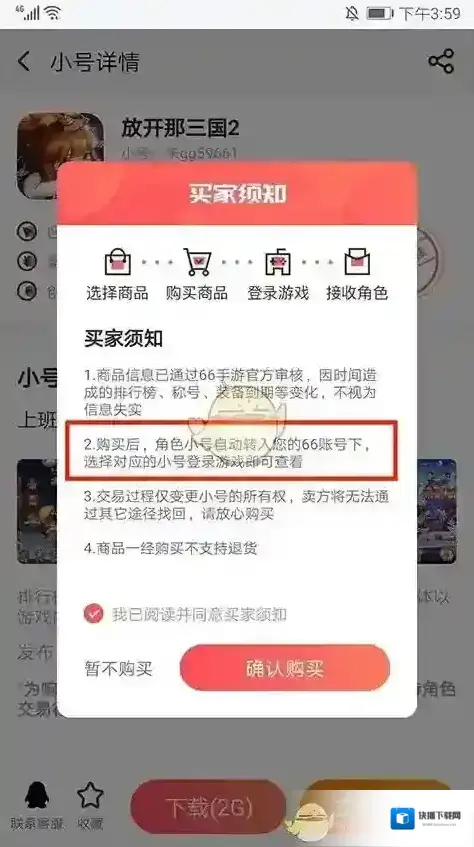 6、在买家须知界面,可看到,购买后,角色小号自动转入您的66账号下,选择对应的小号登录游戏即可查看,然后就可以开始转移小号了。