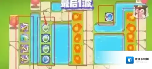 5、然后我们在第6波,在如图所示的位置放1个雷达,可以直接打掉绳索兔,右边放置火瓶子开图。