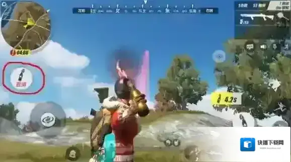 如图将方向杆往上抬(千万记住不是最顶处就是丢得越远),就能丢出大概80米左右的距离!看着有红色引导线的位置就能知道能丢多远!