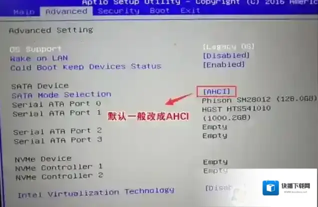 4、再将移动上下方向键,移动到Advanced中将SATA Mode Selection选项的启动项更改为AHCI,否则安装WIN7会出现0x00007b蓝屏,如下图所示,然后再F4 或是F10保存设置重启电脑;