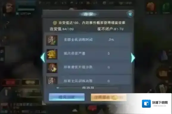 《汉王纷争》有治安值的设定,治安值越高,主城增益越强,所发生的事件的奖励也越高。
