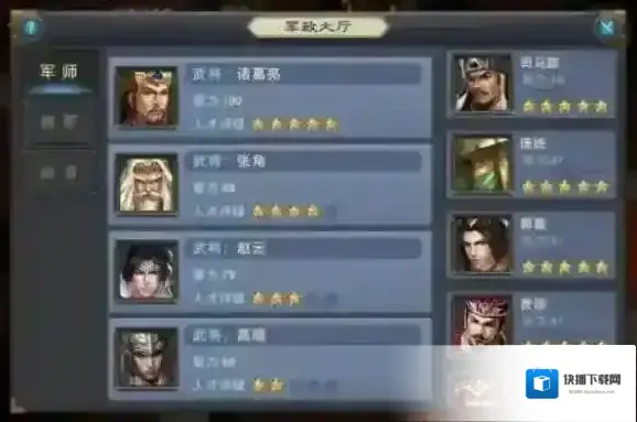 进入主殿可对麾下武将进行册封,册封的星级越高,所发布的任务奖励也就越丰厚。通过人才评级,城主可以直观地进行操作。需要注意的是,一名人才在军师、将军、尚书三类职位上的评级都会有不同,例如武将赵云在军师的评级为三星,但在将军评级是五星,这就需要城主知人善任了!