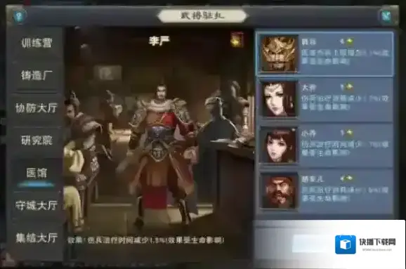 例如在医馆的驻扎中,有增加伤兵上限的、有减少伤兵治疗时间的、有减少伤兵治疗消耗的。这就需要城主根据自身需求安排驻扎工作,要出城战斗了,那就要把增加医馆伤兵上限的韩当老将军派去驻扎,这样可以避免战斗时医馆爆满导致死兵;治疗时可以根据自身的实际情况安排,如果要快速恢复投入战斗,那就需要减少治疗时间;如果对伤兵恢复速度无要求,那么减少伤兵消耗是你的最优选择!